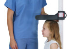 The stadiometer measures from 4.5 in – 81 in and 11.5 cm – 205 cm with 0.125 in / 0.1 cm graduations visible on both sides of the height rod. The PHR stadiometer features a unique reversible head piece that lets you add a DETECTO DR400C digital floor scale at the base to measure weight and height simultaneously.